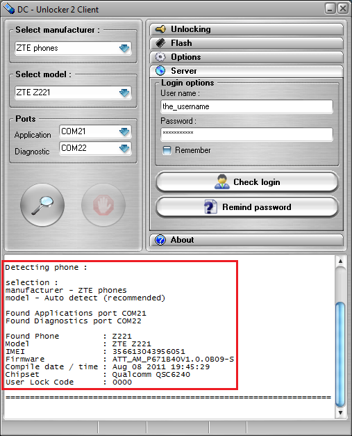 Open Server tab, enter your username and password that you received after credits purchase. Click "Check login". (you can buy credits here www.dc-unlocker.com/buy). If DC-Unlocker/Vygis/Rocker/Infinity dongle is connected, only click " Check login ".